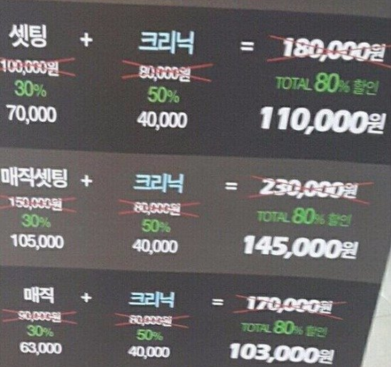 10만원짜리를 30퍼센트 할인 했으니 7만원 맞습니다. 8만원짜리를 50 퍼센트 할인해 줬으니 4만원 맞습니다. 합쳐서, 7만원 더하기 4만원은 11만원 이구요, 30 퍼센트 더하기 50퍼센트면 총 할인율은 80 퍼센트 되겠습니다. 근데 18만원 짜리를 80퍼센트 할인 하면 11만원 아닌데요? 덧셈과 곱셈인데 뭔가 이상하죠. 덧셈과 곱셈이 가미된 분배법칙의 오류군요. 저 광고판의 주장 대로라면 이렇습니다.